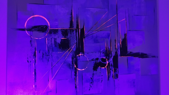 Dimensions de l'œuvre 60 cm x 81 cm sur châssis bois haute qualité. Des couleurs douces et chatoyantes, des contrastes élevés, et une petite touche de peintures fluorescentes pour un effet waouh sous lumière ultra violette. Le fond et les bords de la toile sont réalisés à l'aide de peinture chromée brillante pour un effet métallique.