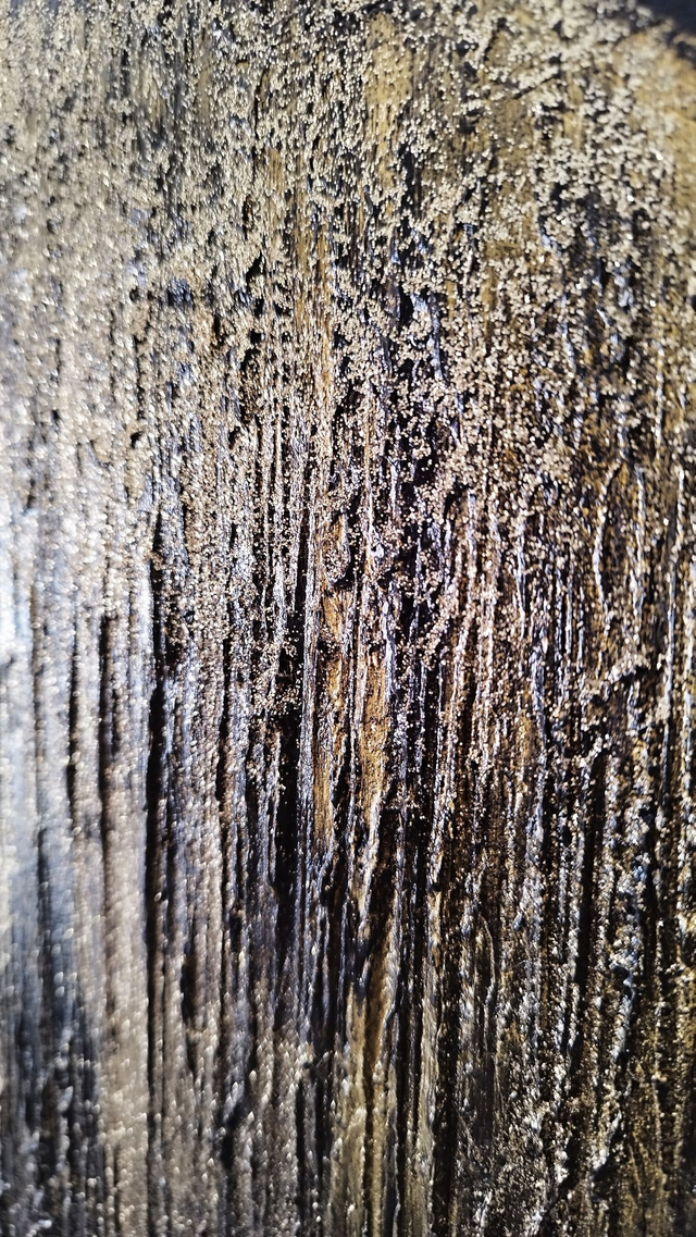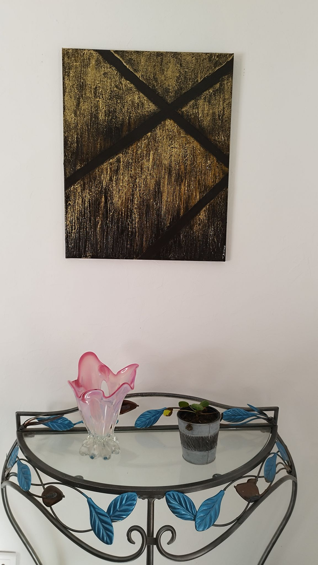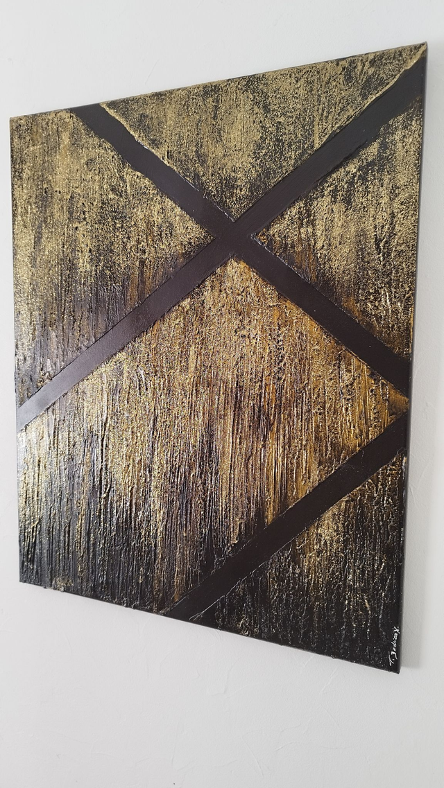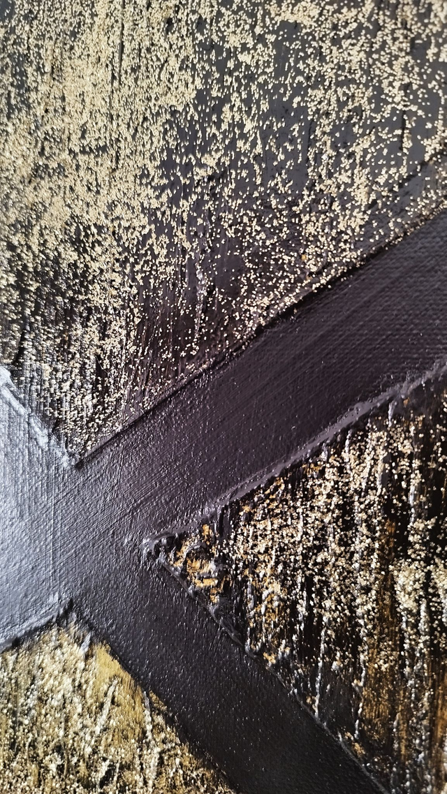 Dimensions de l'œuvre 51 cm x 60 cm sur châssis bois haute qualité toile coton. Un noir intense, des contrastes élevés, sur pâte de structure pour plus de relief, des reflets gold et paillettes gold .... cette toile d'art abstrait saura trouver sa place dans un intérieur contemporain ou même plus classique. L'harmonie des couleurs et l'émotion à faire partager, c'est ce que je recherche dans ma peinture.