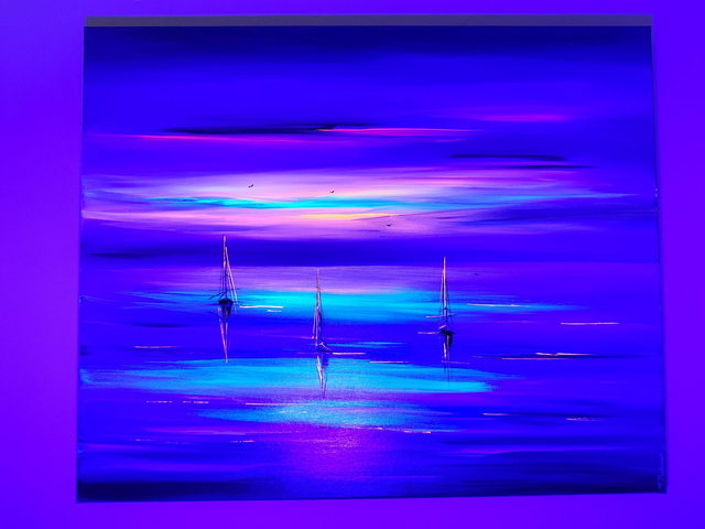 Dimensions de l'oeuvre 50 cm x 61 cm toile coton sur châssis bois. Des couleurs douces et chatoyantes, des contrastes marqués pour cette toile d'art à mi-chemin entre l'abstrait et le figuratif. Si cette oeuvre est superbe à la lumière naturelle elle dispose d'un petit plus ! Le petit plus de cette toile réside dans l'utilisation pour partie de peintures fluorescentes qui vont réagir à la lumière ultra violet. Il suffit donc d'utiliser une petite lampe uv pour obtenir des couleurs spectaculaires à la nuit tombée. Evidemment plus la luminosité sera faible dans la pièce, plus l'effet sera saisissant !