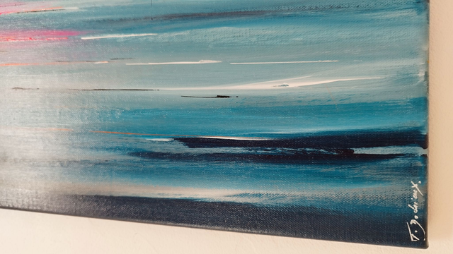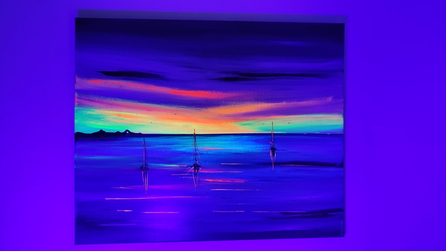 Dimensions de l'oeuvre 51 cm x 60 cm toile coton sur châssis bois (hors encadrement). Des couleurs douces et chatoyantes, des contrastes marqués pour cette toile d'art à mi-chemin entre l'abstrait et le figuratif. Si cette oeuvre est superbe à la lumière naturelle elle dispose d'un petit plus ! Le petit plus de cette toile réside dans l'utilisation pour partie de peintures fluorescentes qui vont réagir à la lumière ultra violet. Il suffit donc d'utiliser une petite lampe uv pour obtenir des couleurs spectaculaires à la nuit tombée. Evidemment plus la luminosité sera faible dans la pièce, plus l'effet sera saisissant !