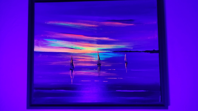 Dimensions de l'oeuvre 51 cm x 60 cm toile coton sur châssis bois. Des couleurs douces et chatoyantes, des contrastes marqués pour cette toile d'art à mi-chemin entre l'abstrait et le figuratif. Si cette oeuvre est superbe à la lumière naturelle elle dispose d'un petit plus ! Le petit plus de cette toile réside dans l'utilisation pour partie de peintures fluorescentes qui vont réagir à la lumière ultra violet. Il suffit donc d'utiliser une petite lampe uv pour obtenir des couleurs spectaculaires à la nuit tombée.