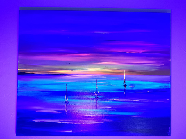 Dimensions de l'oeuvre 50 cm x 61 cm toile coton sur châssis bois. Des couleurs douces et chatoyantes, des contrastes marqués pour cette toile d'art à mi-chemin entre l'abstrait et le figuratif. Si cette oeuvre est superbe à la lumière naturelle elle dispose d'un petit plus ! Le petit plus de cette toile réside dans l'utilisation pour partie de peintures fluorescentes qui vont réagir à la lumière ultra violet. Il suffit donc d'utiliser une petite lampe uv pour obtenir des couleurs spectaculaires à la nuit tombée. Evidemment plus la luminosité sera faible dans la pièce, plus l'effet sera saisissant !