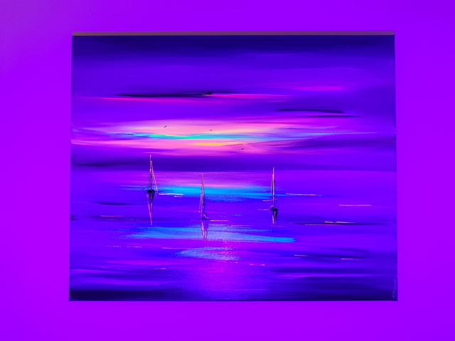 Dimensions de l'oeuvre 50 cm x 61 cm toile coton sur châssis bois. Des couleurs douces et chatoyantes, des contrastes marqués pour cette toile d'art à mi-chemin entre l'abstrait et le figuratif. Si cette oeuvre est superbe à la lumière naturelle elle dispose d'un petit plus ! Le petit plus de cette toile réside dans l'utilisation pour partie de peintures fluorescentes qui vont réagir à la lumière ultra violet. Il suffit donc d'utiliser une petite lampe uv pour obtenir des couleurs spectaculaires à la nuit tombée. Evidemment plus la luminosité sera faible dans la pièce, plus l'effet sera saisissant !