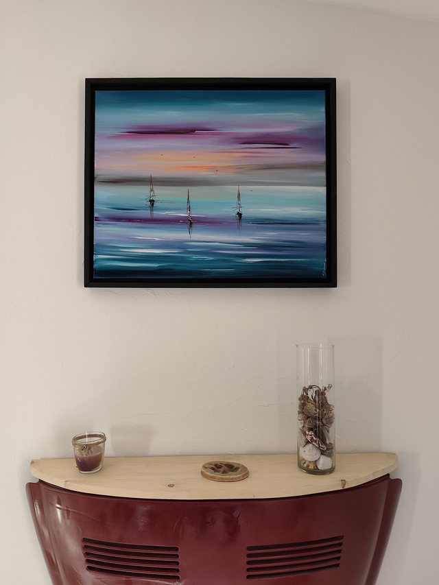 Cette oeuvre saura trouver sa place dans un intérieur contemporain ou même plus classique. L'harmonie des couleurs et l'émotion à faire partager, c'est ce que je recherche dans ma peinture.