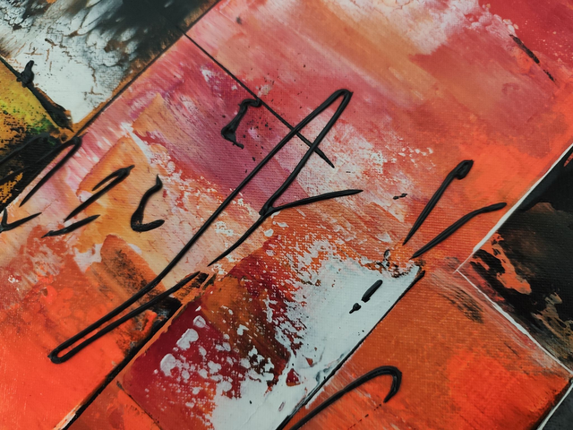 Dimensions de l'oeuvre 40 cm x 40 cm (hors encadrement) toile coton sur châssis bois. Des couleurs vives et chatoyantes, des contrastes marqués, des effets de relief 3D pour cette toile d'art abstrait. Si cette oeuvre est superbe à la lumière naturelle elle dispose d'un petit plus ! Le petit plus de cette toile réside dans l'utilisation pour partie de peintures fluorescentes qui vont réagir à la lumière ultra violet. Il suffit donc d'utiliser une petite lampe uv pour obtenir des couleurs spectaculaires à la nuit tombée. Evidemment plus la luminosité sera faible dans la pièce, plus l'effet sera saisissant !