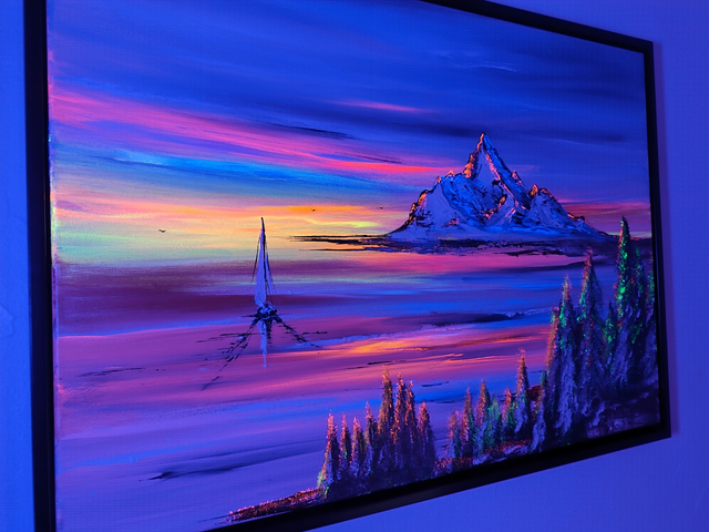Dimensions de l'oeuvre 50 cm x 70 cm (hors encadrement) toile coton sur châssis bois. Des couleurs douces et chatoyantes, des contrastes marqués pour cette toile d'art à mi-chemin entre l'abstrait et le figuratif. Si cette oeuvre est superbe à la lumière naturelle elle dispose d'un petit plus ! Le petit plus de cette toile réside dans l'utilisation pour partie de peintures fluorescentes qui vont réagir à la lumière ultra violet. Il suffit donc d'utiliser une petite lampe uv pour obtenir des couleurs spectaculaires à la nuit tombée.